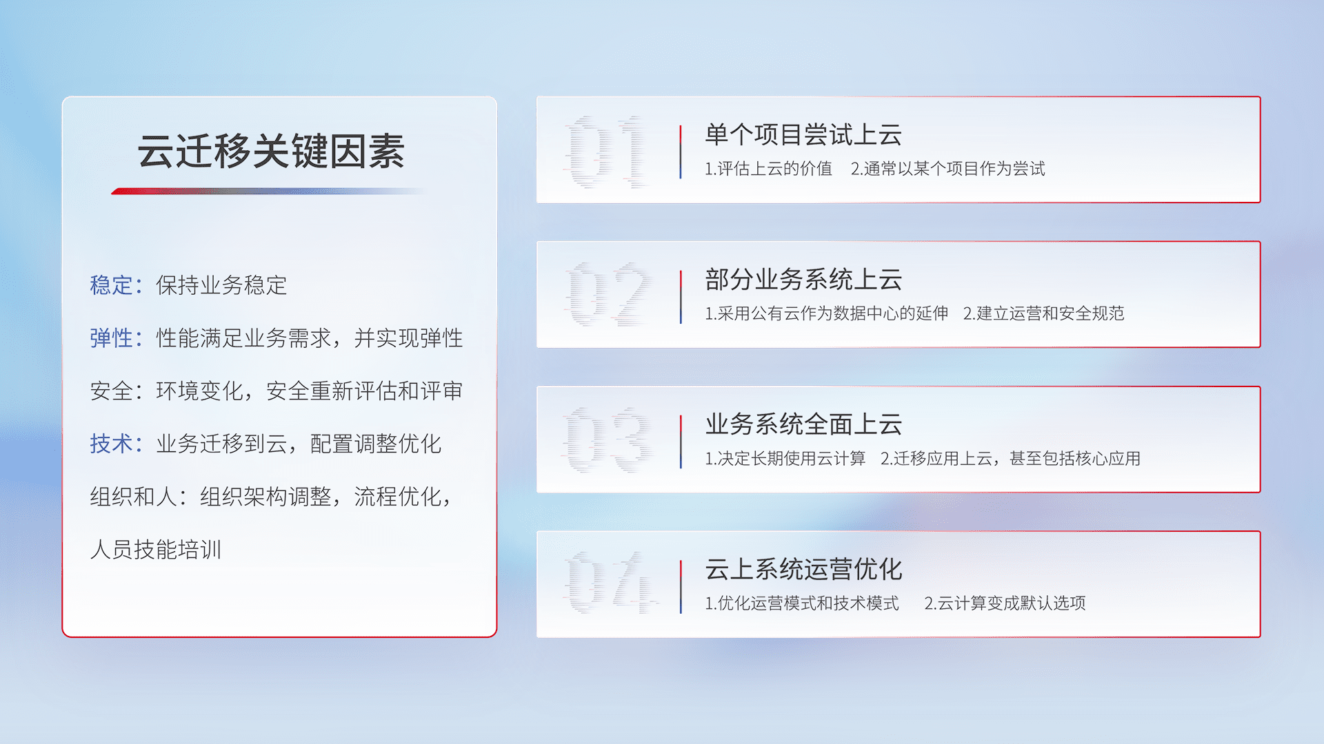 结合实际业务,,,,从规划设计、、、云平台选型、、云原生改造、、、数据迁移、、集成交付,,迁移全过程为客户识别最佳上云路径,,,做好风险识别管理,,设计网络架构、、、身份权限、、、、安全审计合规、、操作审计、、、、日志审计、、、、监控告警策略、、、、多站点容灾设计等,,,,对云上基础设施进行整体规划,,,提升IT治理水平,,以满足弹性、、、高可用、、、、高性能的需求。。。